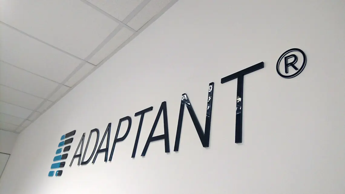 Beim Münchner Startup adaptant, einem Softwarespezialisten, hatten wir einen interessanten Montage-Auftrag zu erledigen: ausgelaserte Acrylbuchstaben, 21 cm hoch, 5 mm dick, sowie das grafische Element des Logos (Fotos weiter unten) – ebenfalls ausgelaserte Einzelteile – sollten an die Wand und dort „schweben“, Halterungen sollten also nicht zu sehen sein.